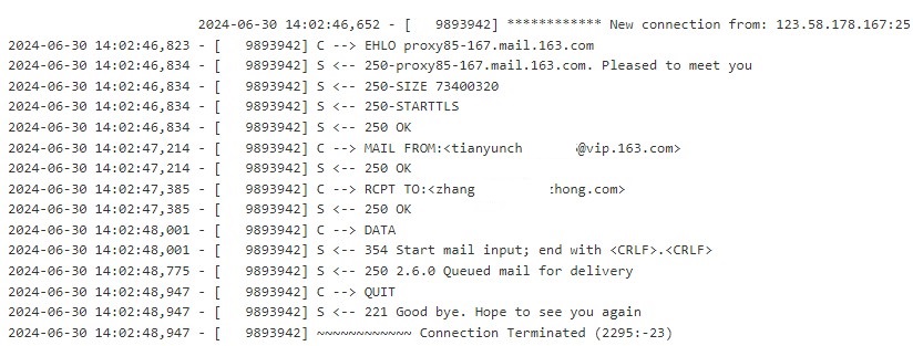 下面这个入站的邮件对话,可以清楚的告诉你,他们外发邮件,不是采用加密的STARTTLS传输,而是明文传输邮件任何信息!